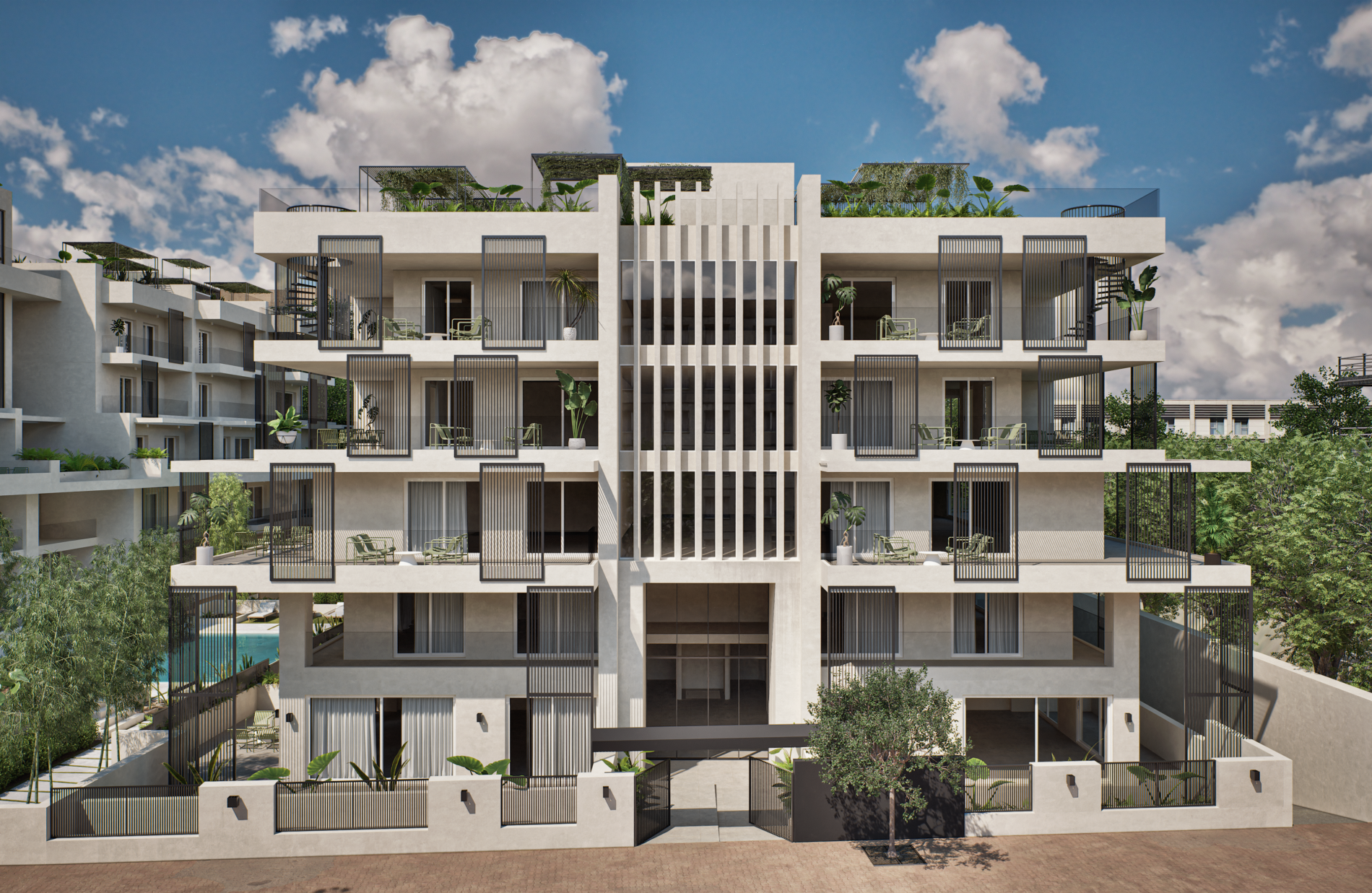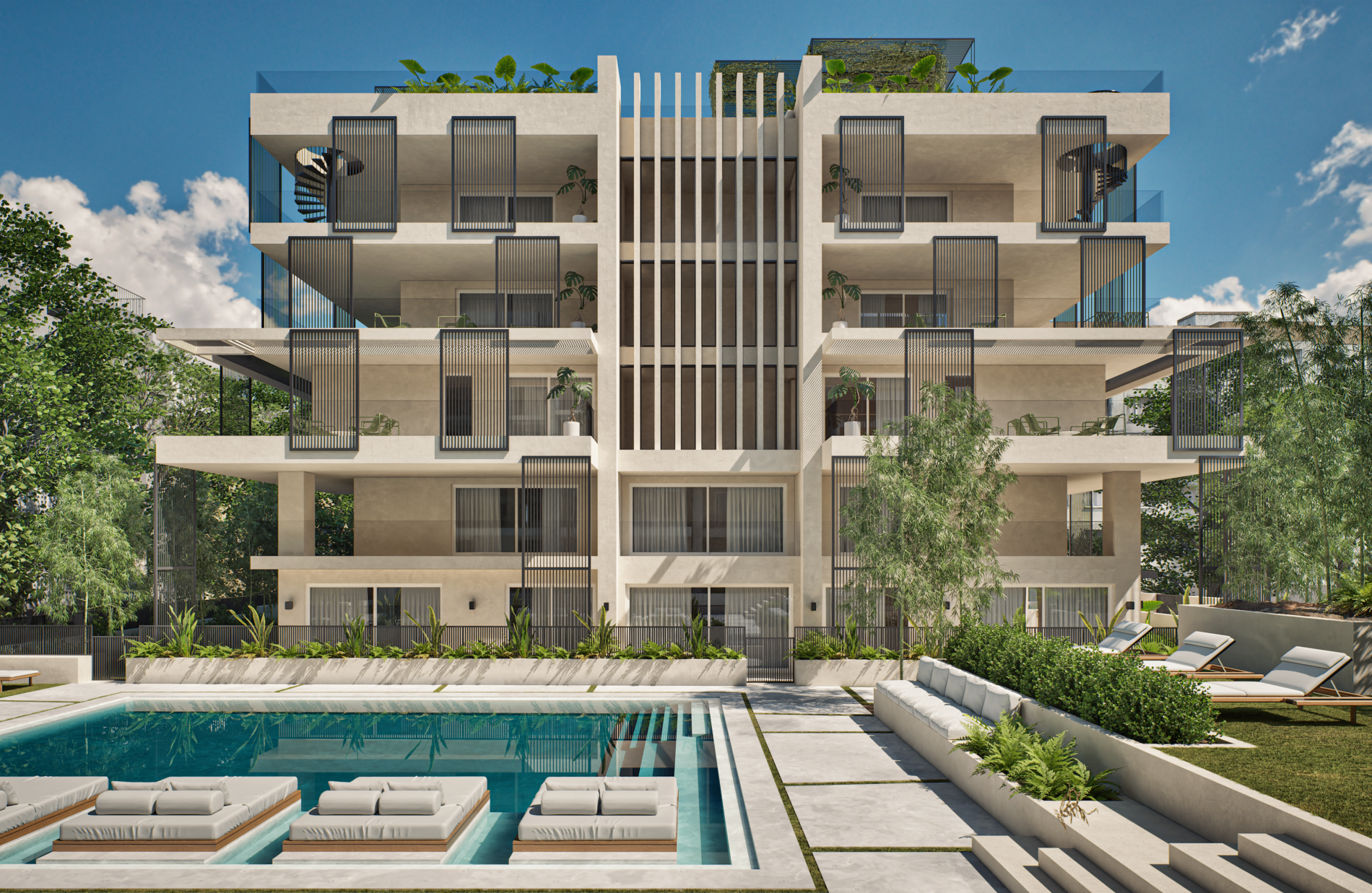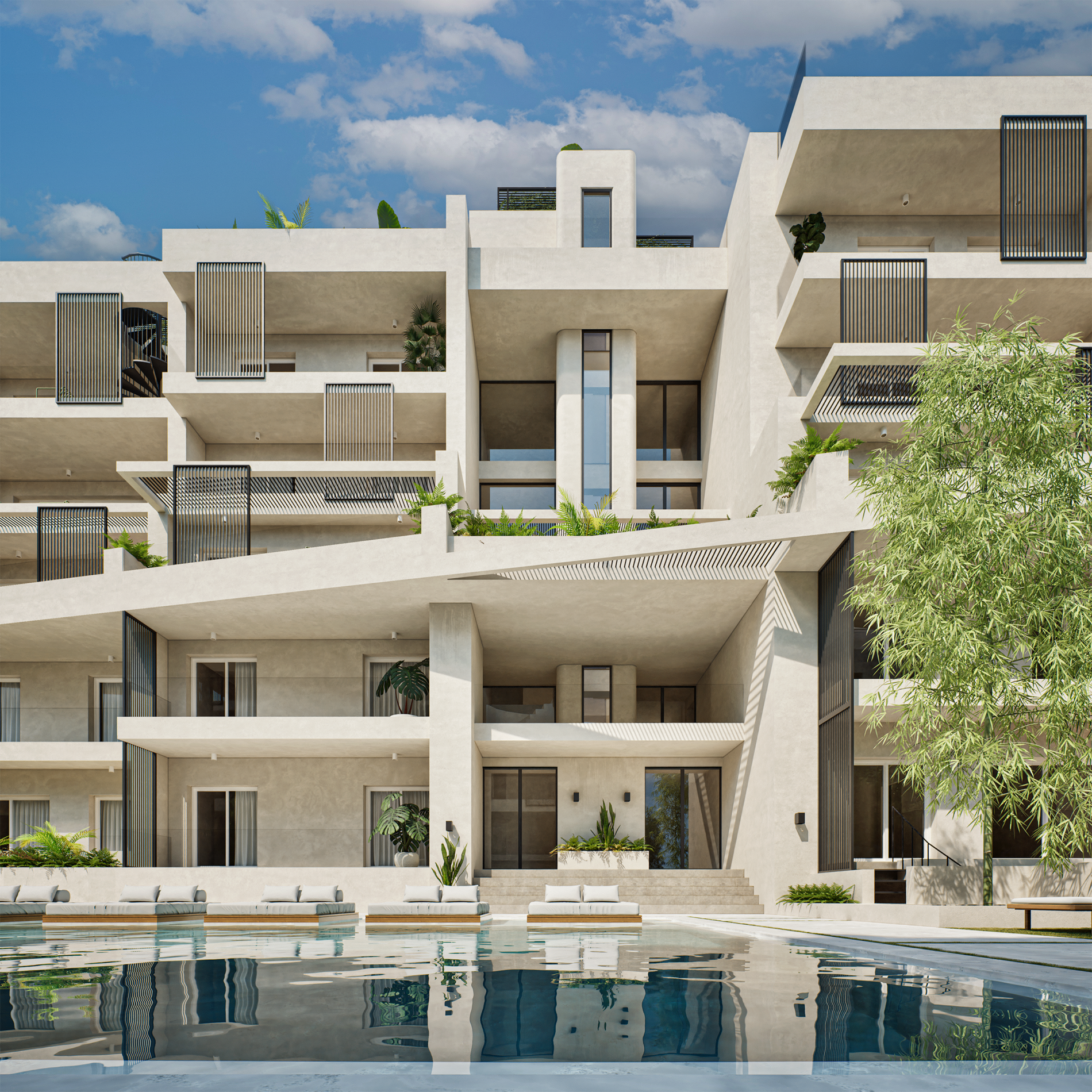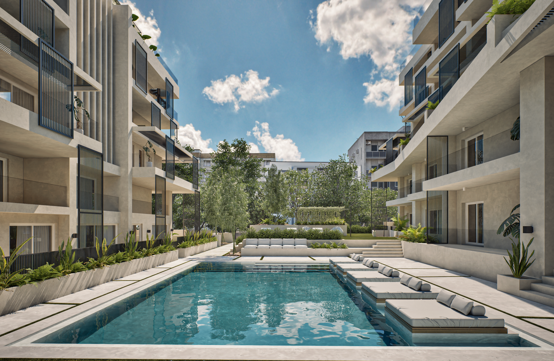 Samirah Luxury residences complex is a testament to thoughtful transformation, repurposing two 1970s industrial buildings into 6.200 sq. m. of modern residences across 59 units. Architectural services covered the entire process, from concept development through detailed design, focusing on redefining both the interior layouts and the external identity of the structures. Reconfigured floor plans introduced efficient apartment living while new façade elements enhanced light, privacy, and visual character. Shared outdoor amenities, including landscaped communal spaces and a central pool, were integrated to enhance the urban living experience. The project demonstrates how strategic architectural intervention can revitalize existing structures and create a modern residential environment that balances functionality, comfort, and community.